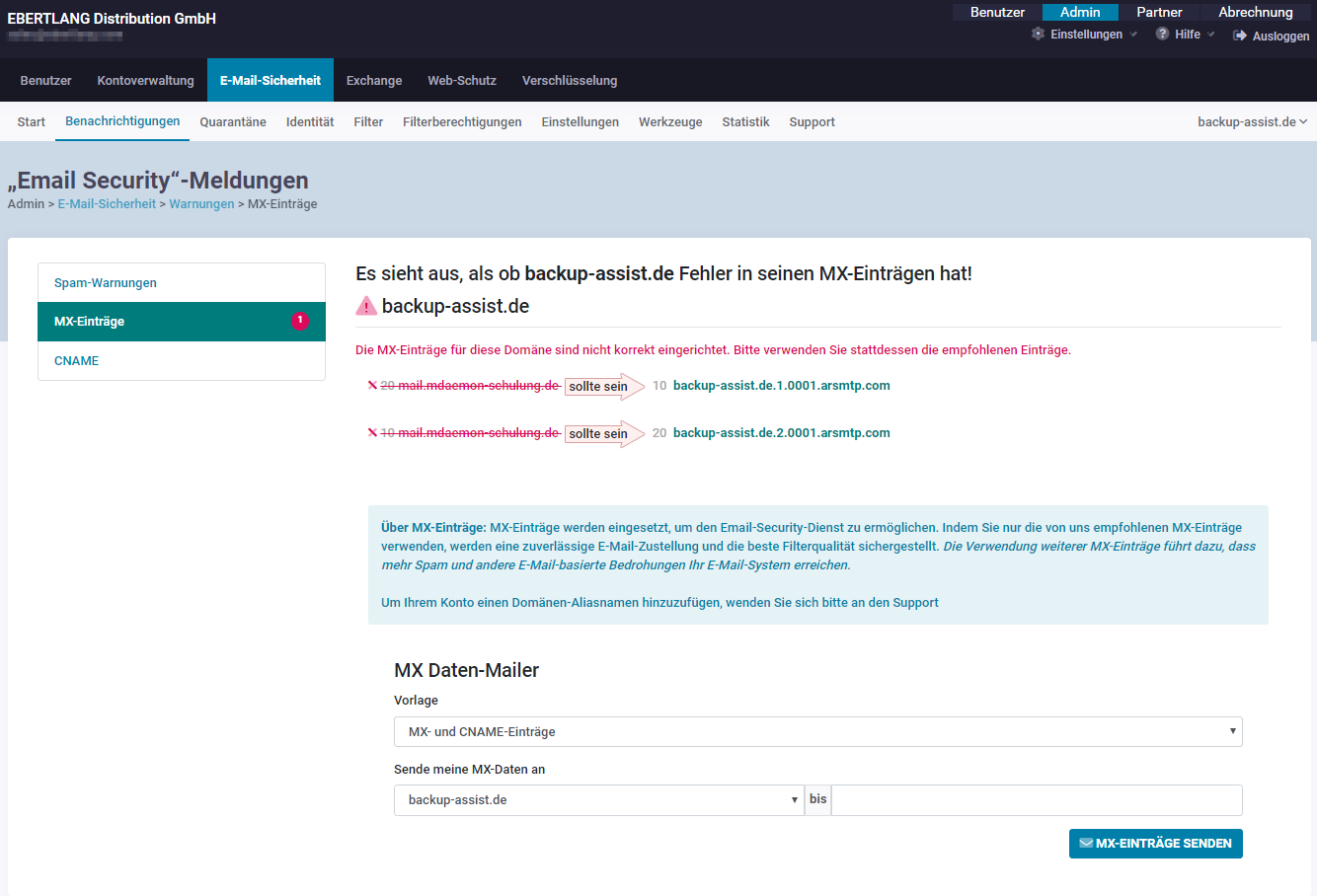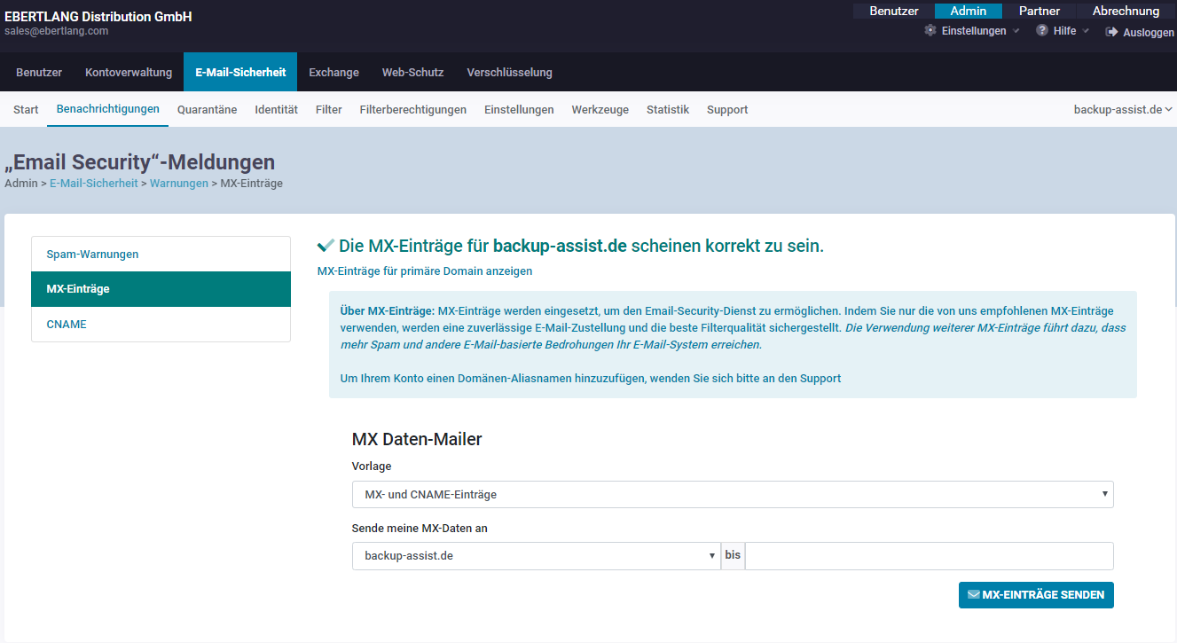 Diese Informationen finden Sie auch im Kundenportal unter dem Reiter E-Mail Sicherheit → Benachrichtigungen. Ein Beispiel: