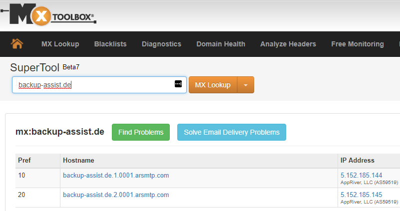 Damit die E-Mails bei AppRiver Hosted Exchange ankommen, ist es notwendig, dass im DNS der MX-Eintrag der Domain von Ihnen oder Ihrem Provider auf die Mailserver von AppRiver umgeändert wird. Sie erhalten nach der Buchung per E-Mail die notwendigen DNS-Änderungen hierfür mitgeteilt. Es müssen zwei MX-Einträge gesetzt bzw. bereits vorhandene überschrieben werden.