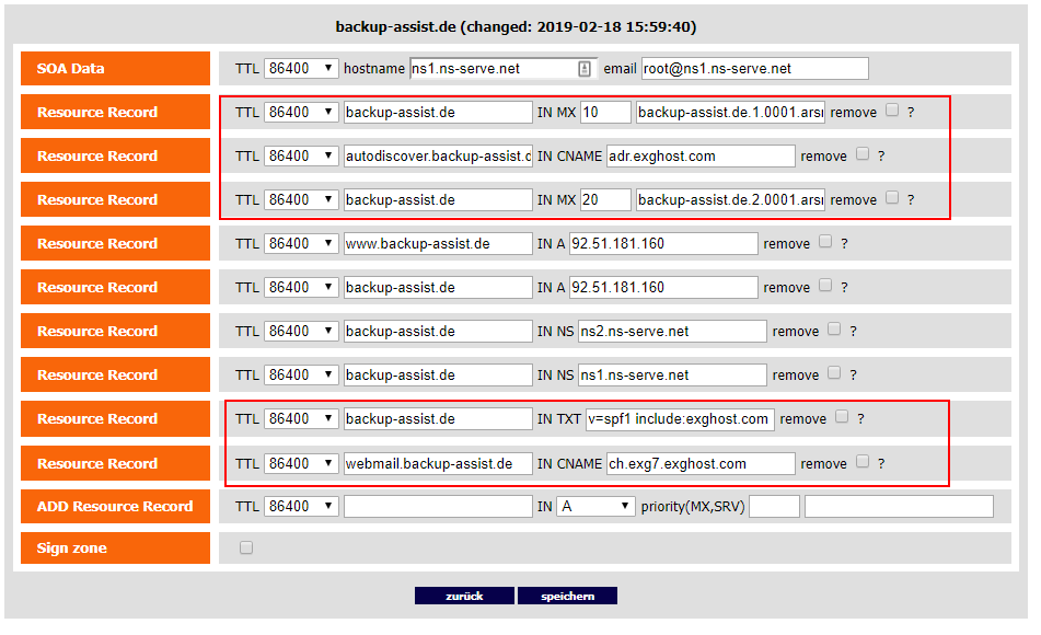 Hier ein Beispiel einer geänderten DNS-Zone: