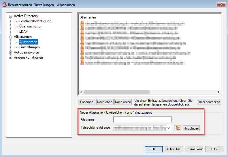 In MDaemon unter dem Menü "Benutzerkonten → Benutzerkonten-Einstellungen → Aliasnamen" einen neuen Aliasnamen erstellen.