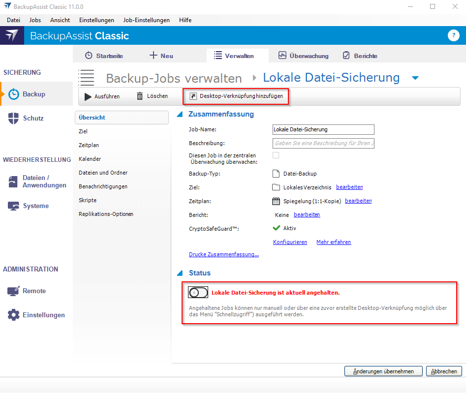Zur Vorbereitung müssen Sie in den Job-Einstellungen von BackupAssist Classic eine Desktop-Verknüpfung erstellen. Navigieren Sie dafür zu Verwalten→ Name des gewünschten Jobs und klicken Sie dann auf Desktop-Verknüpfung hinzufügen. Bitte achten Sie darauf, dass die automatische Ausführung des Jobs durch BackupAssist dafür ausgeschaltet sein muss.