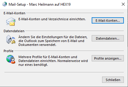 Als erster Schritt wird über die Systemsteuerung ein neues E-Mail-Profil angelegt. Im Mail Setup von Outlook wählen Sie "Profile anzeigen..." und klicken dann auf "Hinzufügen".