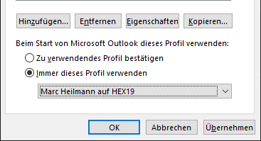 Nun gibt es optional die Möglichkeit unter den Profil-Eigenschaften das neue Profil als Standardkonto beim Start von Outlook zu verwenden.