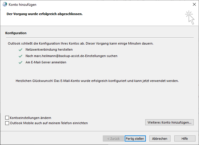 Nachdem die Verbindung erfolgreich hergestellt wurde, erstellen Sie das Konto mit einem Klick auf "Fertig stellen".