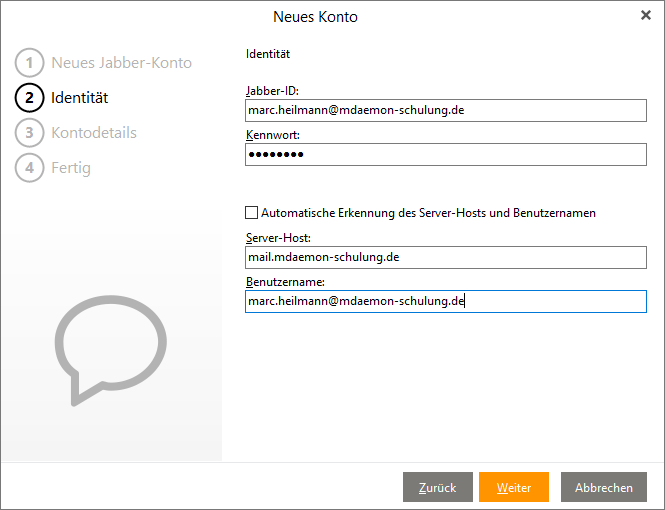 Nun geben wir die Identität unseres Kontos ein, hier werden die Jabber-ID - gleichzusetzen mit der E-Mail-Adresse des Benutzers - das Kennwort und der Jabber-Server abgefragt: