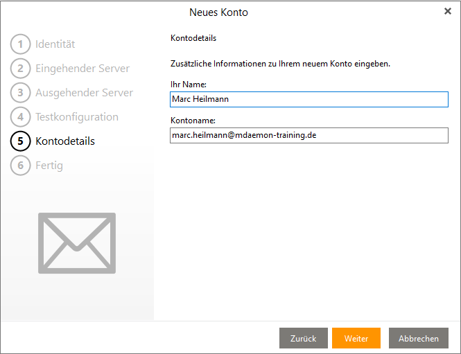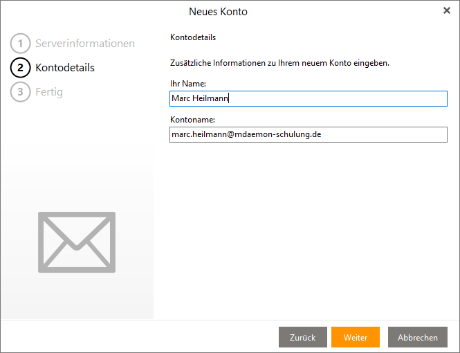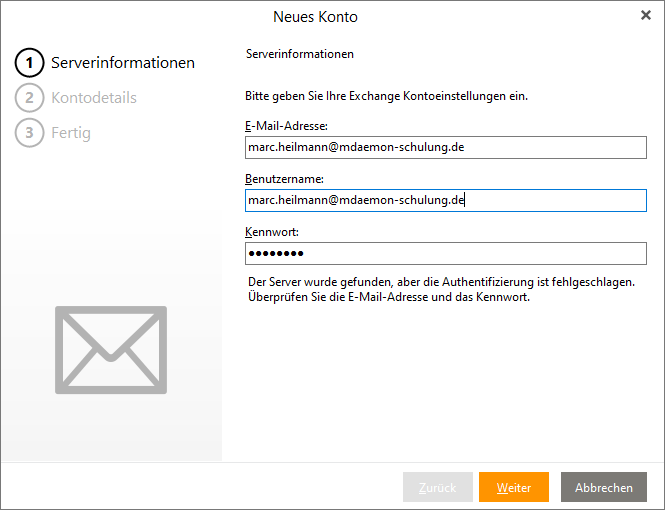 Wenn ein AutoDiscovery-Eintrag besteht, kann nun mit einem Klick auf "Weiter" die Verbindung zum MDaemon Email Server hergestellt werden. Eine Erläuterung der Einrichtung ohne bestehenden AutoDiscovery-Eintrag finden Sie im unteren Teil des Artikels. Im darauffolgenden Fenster werden die Kontodetails mit einem Klick auf "Weiter" bestätigt: