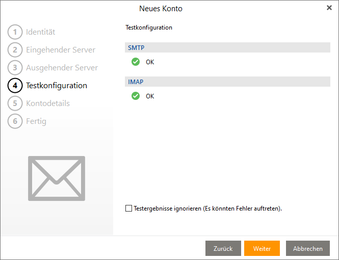 Mit einem Klick auf "Weiter" werden diese bestätigt. Nun können die E-Mails für das eingetragene Konto synchronisiert und versendet werden.