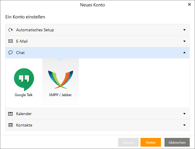 Hier haben Sie nun die Möglichkeit, den Punkt "Chat" auszuwählen, als Protokoll wählen wir hier "XMPP / Jabber".