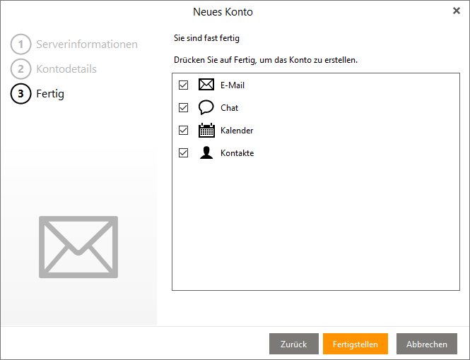 Abschließend haben wir noch die Möglichkeit, zu entscheiden, welche Ressourcen wir synchronisieren möchten, in unserem Fall alle vier. Die Chat-Verbindung wird via XMPP hergestellt, Kalender und Kontakte werden mit CalDAV und CardDAV synchronisiert. Hierbei ist zu beachten, dass der MDaemon XMPP Server aktiviert sein muss. Dies können Sie im MDaemon unter Einstellungen → Web- & IM-Dienste → XMPP prüfen. Außerdem muss der CalDAV/CardDAV-Server aktiviert sein, dies ist unter Einstellungen → Web- & IM-Dienste → CalDAV & CardDAV zu überprüfen.