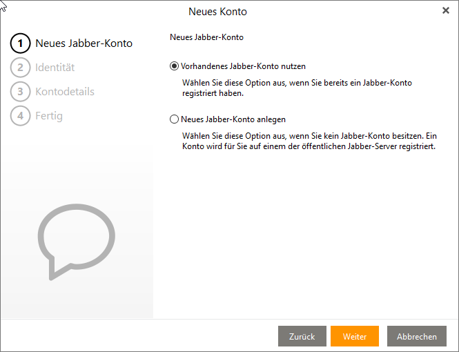Im nächsten Schritt muss die Wahl getroffen werden, ob ein vorhandenes Jabber-Konto verwendet oder ein neues erstellt werden soll. In unserem Fall wählen wir "Vorhandenes Jabber-Konto nutzen" und bestätigen mit "Weiter".