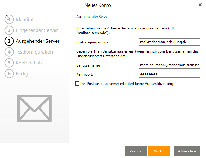 Gleiches passiert hier mit dem Postausgangsserver. Bitte beachten Sie, dass der MDaemon per Standard eine Authentifizierung benötigt.