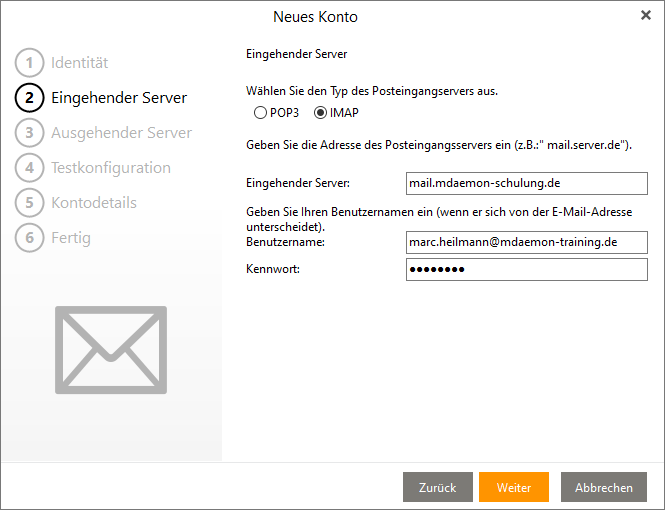 Hier geben wir nun an, ob die Konfiguration des eingehenden E-Mail-Verkehrs via POP3 oder IMAP durchgeführt werden soll. Hier wird auch der FQDN beziehungsweise die öffentliche IP-Adresse des E-Mail-Servers eingetragen, von dem die Nachrichten empfangen werden sollen.