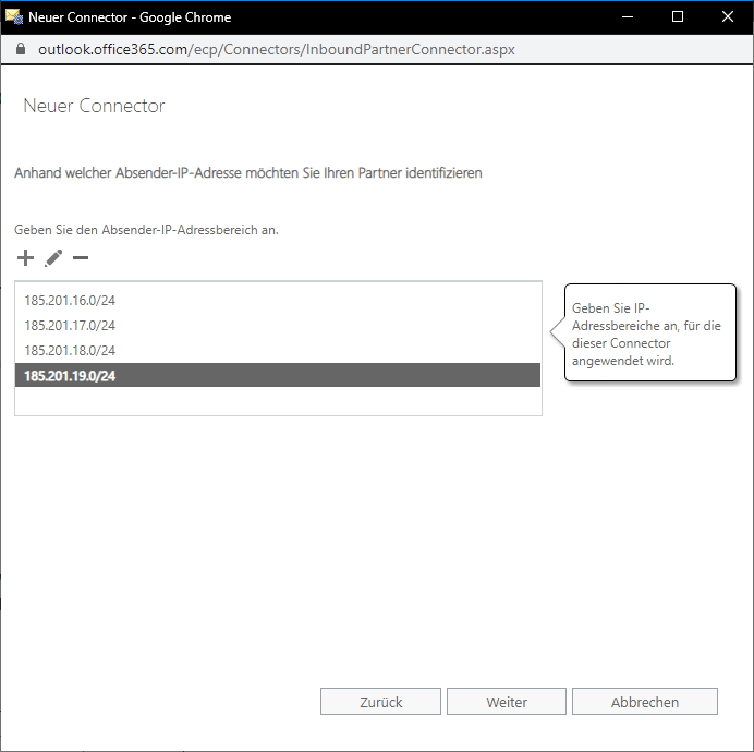 4. Nun erfolgt die Vergabe der IP-Adressbereiche, anhand derer Mail Assure identifiziert werden kann. Diese lauten wie folgt: