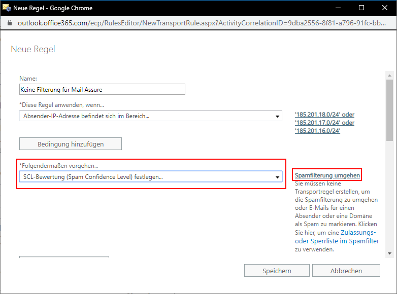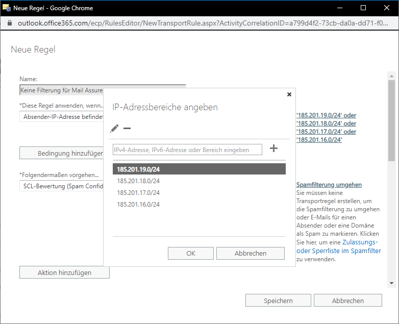 Hierbei ist zu beachten, dass die Regel dann angewendet wird, wenn die IP des Absenders in einem bestimmten Bereich oder exakt mit einer IP-Adresse übereinstimmt. Hierfür wählen Sie bei "Diese Regel anwenden wenn..." → "Sender" → "IP liegt in einem dieser Bereiche oder stimmt genau überein". Dort müssen erneut die vier IP-Adressbereiche eingetragen werden.