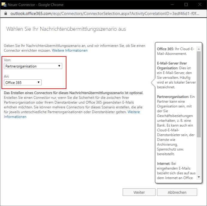 Gehen Sie nun auf "+" und wählen als "Von" die Partnerorganisation. Im Feld "An" wird "Office 365 eingetragen.