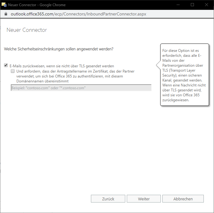 5. Jetzt stellen Sie sicher, dass die Option "E-Mails zurückweisen, wenn sie nicht über TLS gesendet werden" aktiviert ist und bestätigen dann mit einem Klick auf "Weiter".