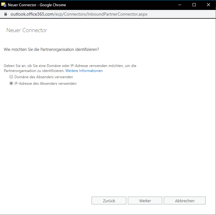Im darauffolgenden Fenster wählen Sie "IP-Adresse des Absenders verwenden" um die Partnerorganisation zu identifizieren.
