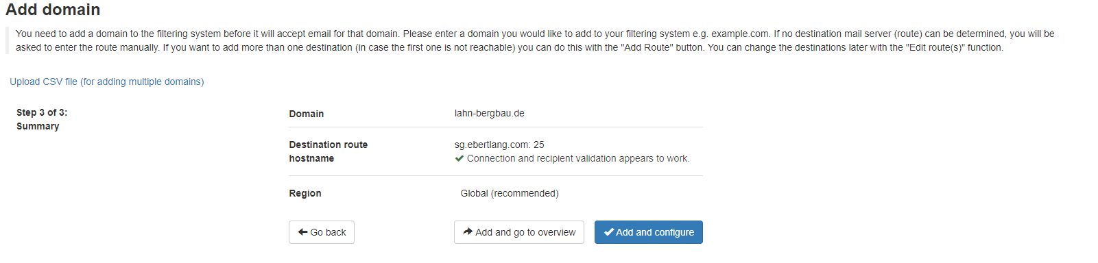 Zu Beginn wird der Domänenname und der "Destination Route Hostname" angegeben, der von Mail Assure automatisch eingetragen wird. Die Informationen werden dann mit "Add and Configure" bestätigt.