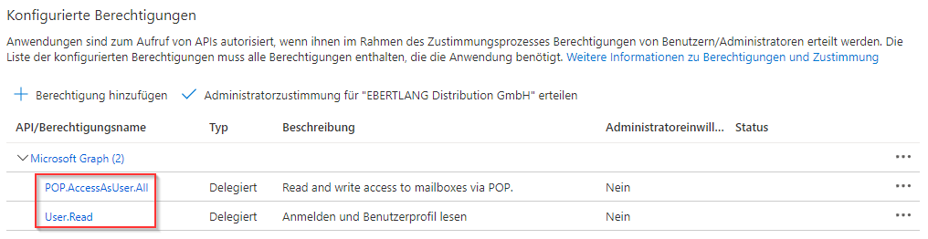 Klicken Sie auf "Berechtigung hinzufügen", um die ausgewählten Berechtigungen der App-Registrierung hinzuzufügen. Im "API-Berechtigungen"-Tab sollten nun die beiden Berechtigungen ("POP.AccessAsUser.All", "User.Read") aufgeführt werden.