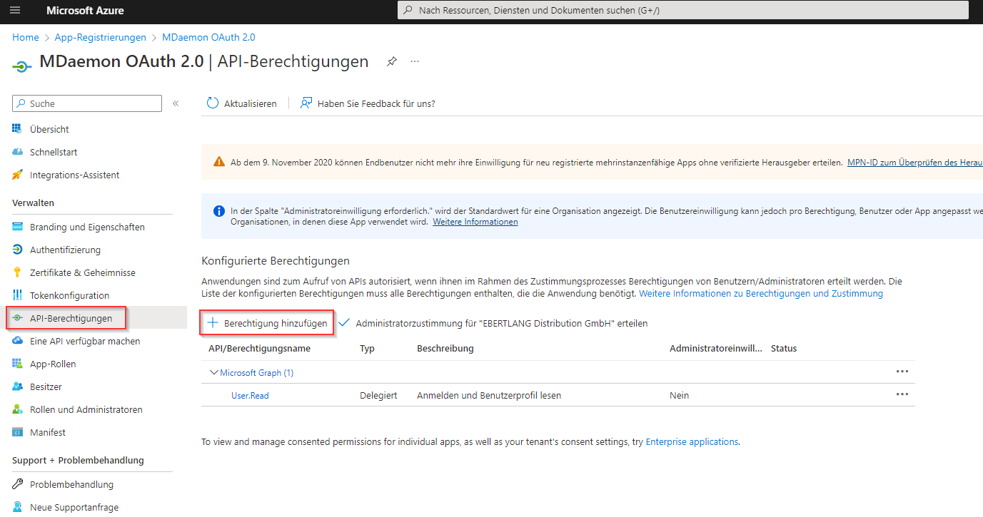 Sollte in der Übersicht "API-Berechtigungen" die Berechtigung "User.Read" fehlen, wählen Sie diese in diesem Schritt ebenfalls aus. Allerdings sollte diese standardmäßig bereits zugewiesen sein.