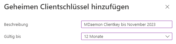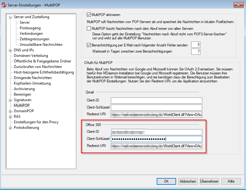 Tragen Sie die vorher notierte Anwendungs-ID und den eben ermittelten Clientschlüssel in der MDaemon Email Server-Verwaltungskonsole unter dem Menüpfad Einstellungen → Server-Einstellungen → MultiPOP bei "Office365" als "Client ID" und "Client Secret" ein.