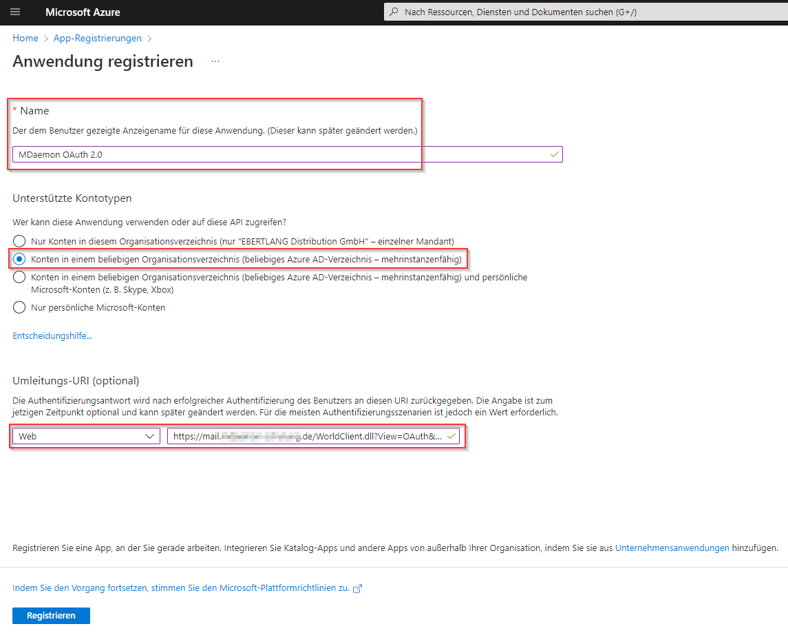 - Geben Sie bei der Umleitungs-URI als Platform "Web" an und tragen Sie die folgende URL ein, wobei Sie <ihredomain.com> durch die Domäne (+Port) ersetzen, welche Sie im Browser verwenden, um Ihren Webmailer von außerhalb Ihres lokalen Netzwerkes zu erreichen: https://<ihredomain.com>/WorldClient.dll?View=OAuth&AuthRequest=Office365