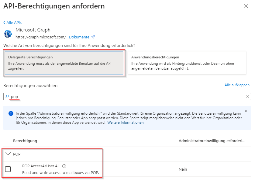 Suchen Sie nach "POP" und setzen Sie einen Haken bei der Berechtigung "POP.AccessAsUser.All".