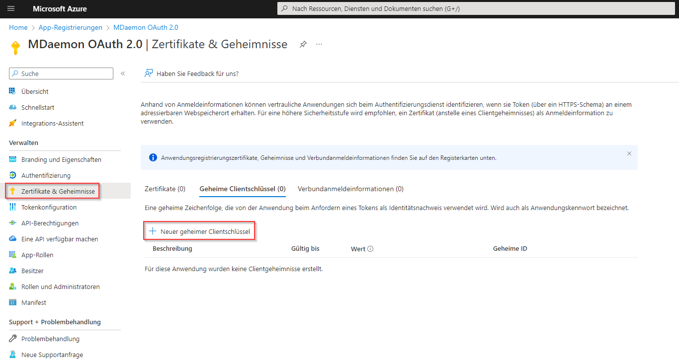 - Wählen Sie in der linken Menüleiste den Tab "Zertifikate & Geheimnisse" aus.