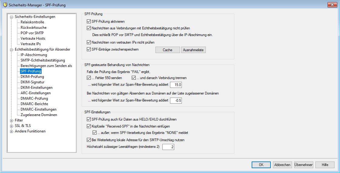Das Sender Policy Framework – kurz SPF – ist ein Verfahren, mit dem das Fälschen der Absenderadresse einer E-Mail verhindert werden soll. Es schränkt dafür die legitimierten E-Mail-Server, die für den Versand von Nachrichten einer bestimmten Domäne autorisiert sind, entsprechend ein. Es dürfen also nur bestimmte E-Mail-Server im Namen der Domäne versenden. Im MDaemon finden Sie die Einstellungen zu der SPF-Prüfung unter Sicherheit → Sicherheits-Manager → Echtheitsbestätigung für Absender → SPF-Prüfung.