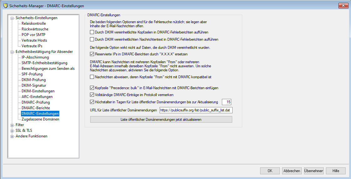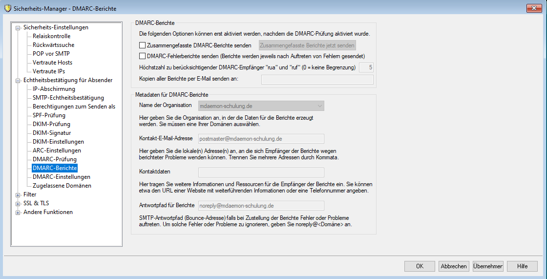 Der letzte Menüpunkt "DMARC-Einstellungen" bietet darüberhinaus erweiterte Einstellungen für Fehlerberichte sowie die Protokollierung an: