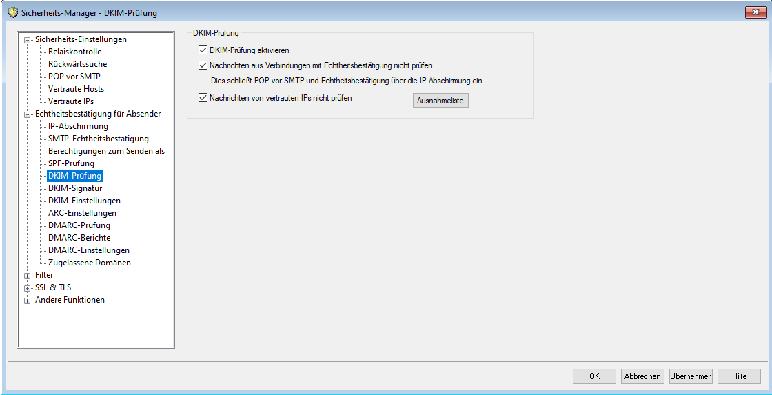 Im MDaemon finden Sie innerhalb von Sicherheit → Sicherheits-Manager → Echtheitsbestätigung für Absender → DKIM-Prüfung die Möglichkeit, die Prüfung von Nachrichten auf eine valide DKIM-Signatur zu aktivieren: