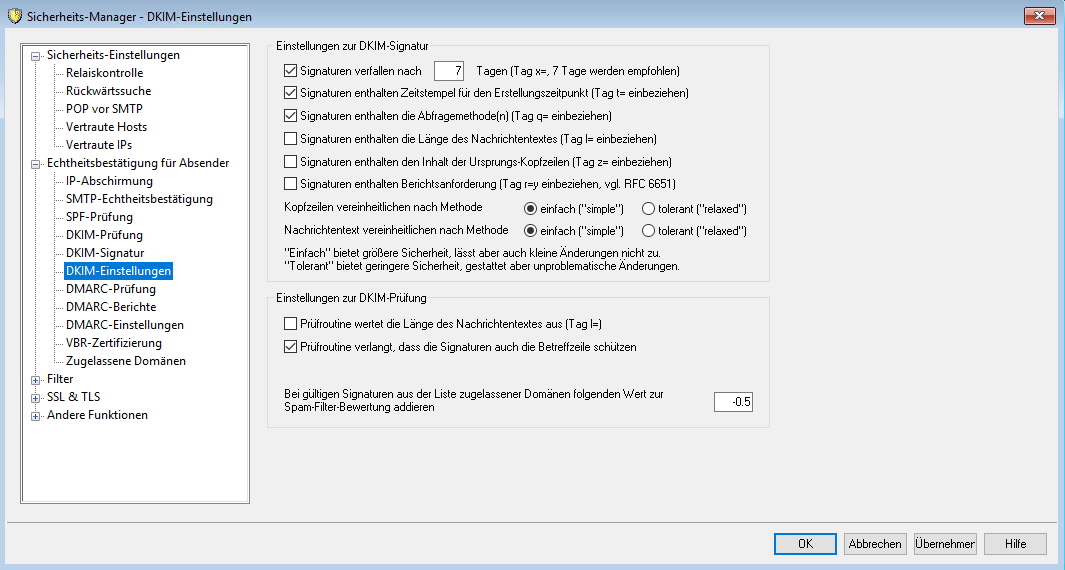 Hier befinden sich weitere Einstellungen zu der DKIM-Signatur sowie zur DKIM-Prüfung. Weitere Informationen stehen Ihnen hier zur Verfügung.
