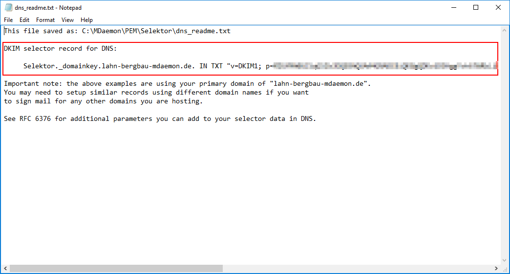 Im rot markierten Bereich befindet sich der DNS-Eintrag, der als TXT-Ressource Record hinterlegt werden muss. Der Bereich "Selektor._domainkey.lahn-bergbau-mdaemon.de" zählt hierbei als Bezeichnung des TXT-Eintrages. Der Bereich ab "v=DKIM1;" bezeichnet die genutzte DKIM-Version und den öffentlichen Schlüssel, der hier als eigentlicher Inhalt des TXT-Eintrages gilt.