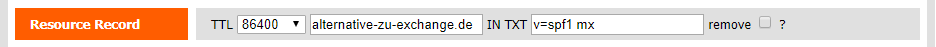 Hier finden Sie nun verschiedene Optionen für die SPF-Prüfung, beispielsweise für die Ausnahme der Prüfung von echtheitsbestätigten Verbindungen oder von vertrauten IP-Adressen. Zudem kann definiert werden, was mit Nachrichten passieren soll, die durch die SPF-Prüfung fallen. Hier besteht die Möglichkeit, eine negative Bewertung zu der Spam-Bewertung zu addieren oder die Verbindung direkt zu trennen. Nachfolgend finden Sie ein Beispiel eines SPF-Eintrages, der als TXT-Record in den DNS-Einstellungen der Domäne eingetragen werden muss: