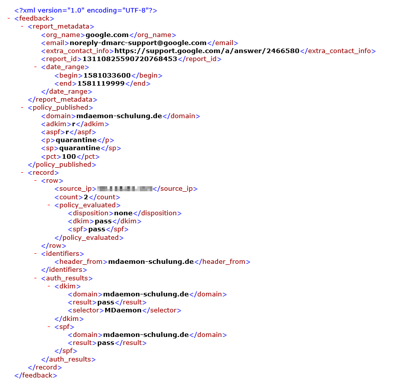 Hier können Sie einstellen, dass der Versand zusammengefasster DMARC-Berichte und DMARC-Fehlerberichte nach dem Auftritt eines Fehler verschickt werden. Die Organisation sowie der Standard-Empfänger sind bereits eingetragen und können beliebig verändert werden. Der Bericht wird in Form einer XML-Datei per E-Mail verschickt und stellt sich folgendermaßen dar: