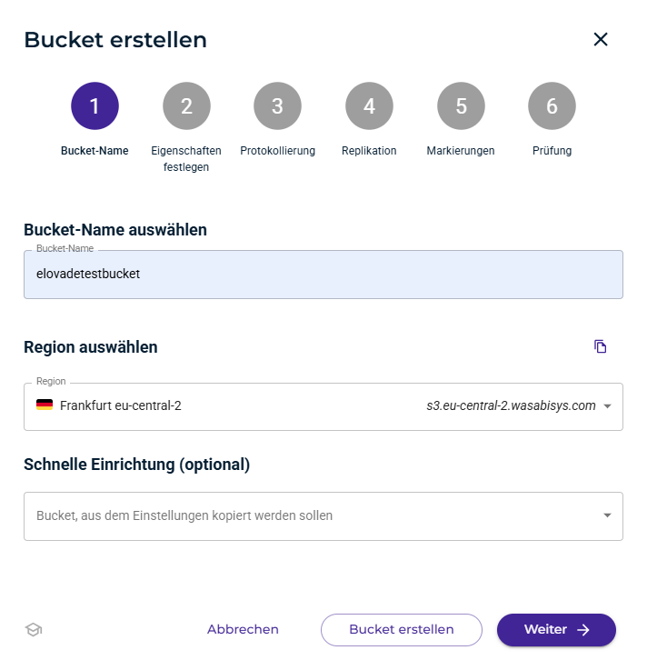 EL storage: Bucket direkt in der Wasabi Console erstellen