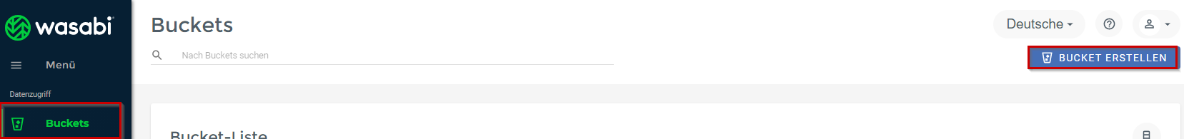 Nun müssen Sie noch einen Bucket erstellen, in den Sie die Sicherung schreiben möchten. Wählen Sie hierfür "Buckets" aus dem Menü-Band aus. Über die Schaltfläche "BUCKET ERSTELLEN" können Sie nun einen neuen Bucket erstellen.