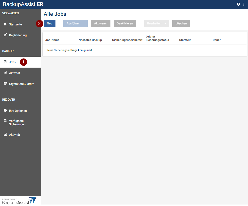 Öffnen Sie Ihre BackupAssist ER-Konsole, navigieren Sie zu Jobs und erstellen Sie über Neu einen neuen Backup-Job.