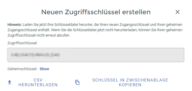 - Über das Dialogfeld ERSTELLEN werden jetzt der Zugriffs- und der Geheimschlüssel erstellt. Der Geheimschlüssel lässt sich über Show anzeigen. Speichern Sie die beiden Zugriffsschlüssel sicher ab oder laden Sie sich diese als CSV-Datei herunter (Hinweis: In der Wasabi Konsole lässt sich der Geheimschlüssel später nicht mehr anzeigen!)