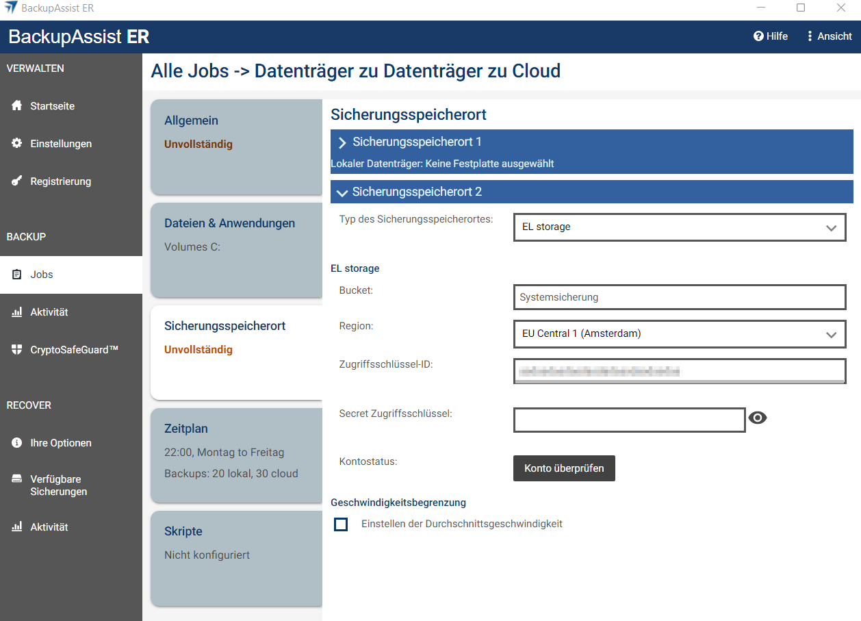 Als Sicherungsspeicherort 2 können Sie nun EL storage einrichten. Wählen Sie dazu als Typ des Sicherungsspeicherortes EL storage aus. BackupAssist ER erstellt für Sie bei jedem Backup-Job einen entsprechenden Bucket – vergeben Sie für diesen einen Namen. Wählen Sie unter Region die entsprechende Region aus, in welcher Ihr Bucket angelegt werden soll. Tragen Sie anschließend Ihren Zugriffsschlüssel und Ihren Geheimschlüssel ein. Optional können Sie eine Geschwindigkeitsbegrenzung für den Backup-Job einrichten.