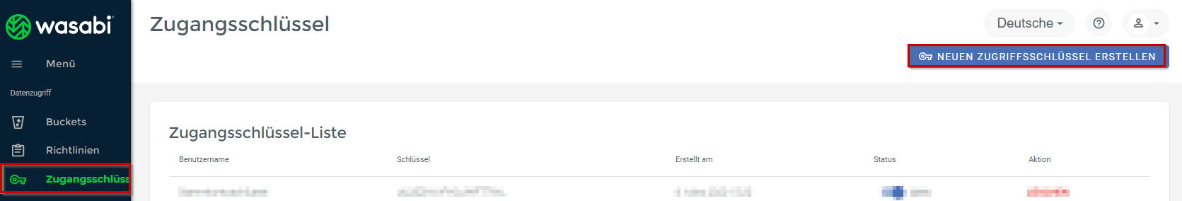 Wählen Sie den Menüpunkt Zugangsschlüssel aus und klicken Sie auf die Schaltfläche NEUEN ZUGRIFFSSCHLÜSSEL ERSTELLEN.
