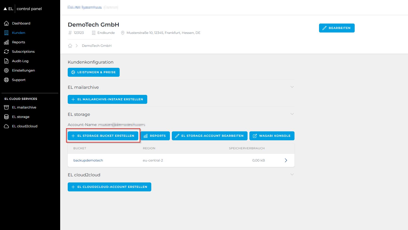 Wählen Sie im Kundenbereich nach Anlage desselben den Endkunden aus, in dessen EL storage Account ein neuer Bucket angelegt werden soll.