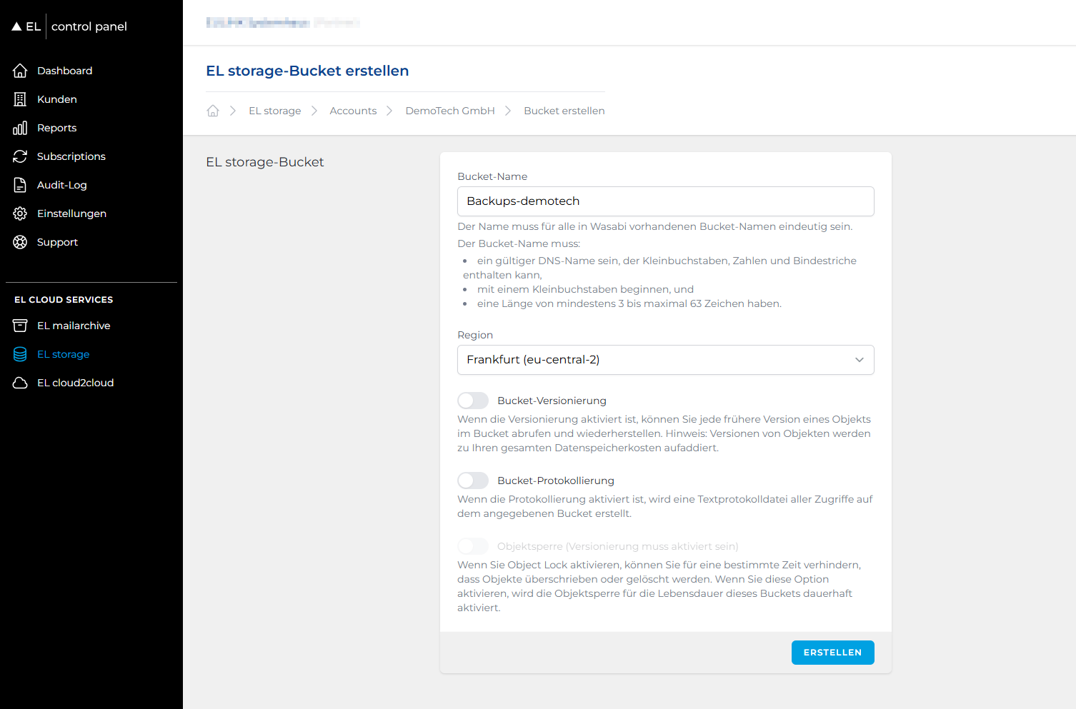Unter EL STORAGE-BUCKET ERSTELLEN werden Ihnen anschließend die folgenden Optionen zur Verfügung gestellt: