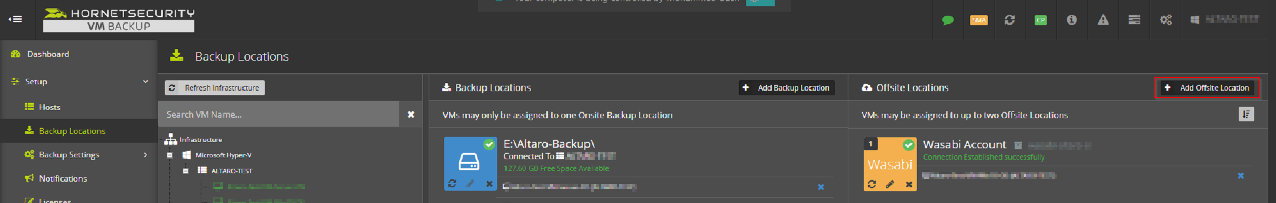 Nun müssen wir nur noch die Konfiguration Ihres neuen Wasabi-Kontos als externen Backup-Speicherort in Altaro hinterlegen. Um Ihren Wasabi Storage-Account als externes "Copy Location" für Ihre VMs zu verwenden, gehen Sie bitte wie folgt vor: