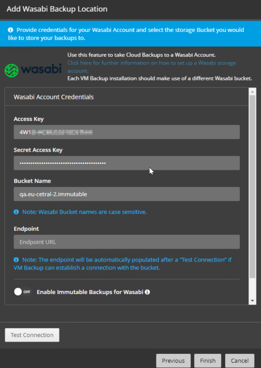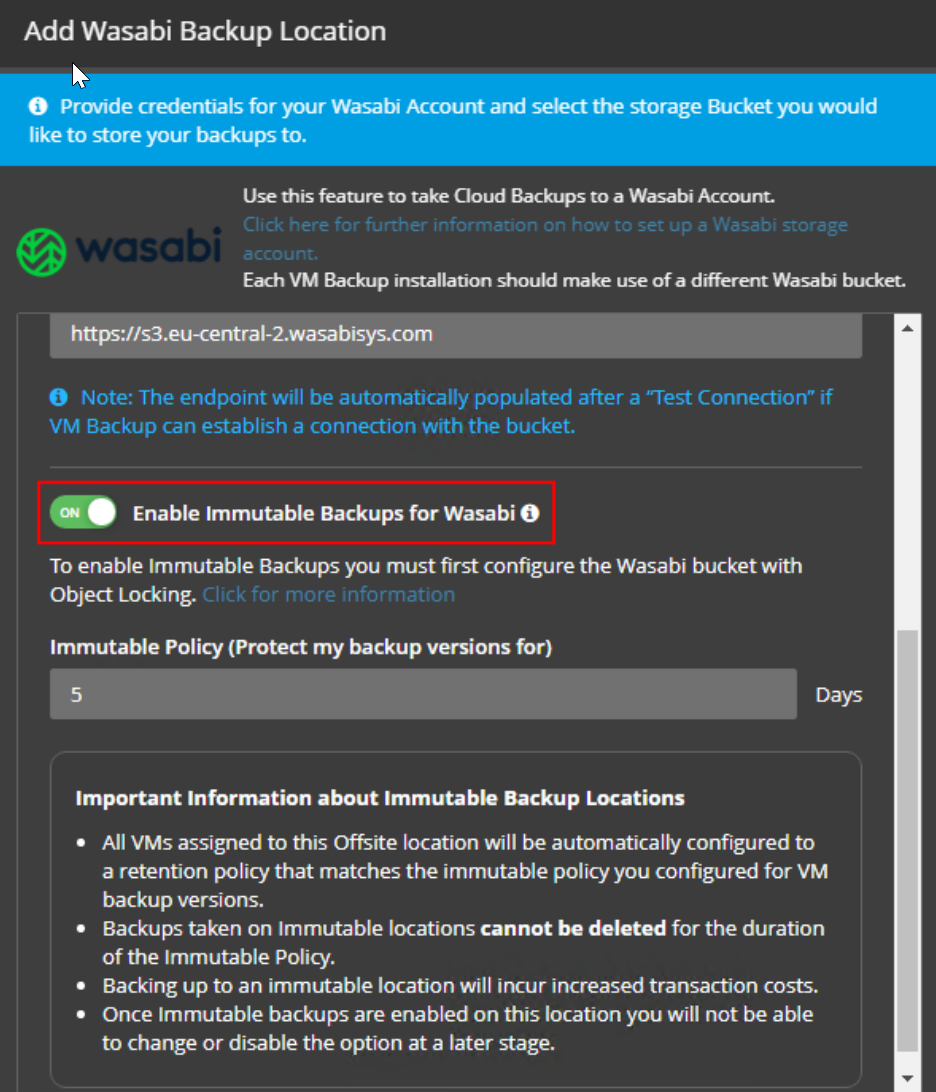 Geben Sie dann den "Access Key / Zugangsschlüssel" und "Secret Access Key / Geheimschlüssel" (siehe oben) und danach den Bucket-Namen (bitte Groß-/Kleinschreibung beachten) ein: Hinweis: Der entsprechende "Endpoint" wird automatisch erkannt und ausgefüllt nachdem sie auf den "Test Connection" Button gedrückt haben. Wenn Sie Immutable Backup für Wasabi aktivieren möchten, können Sie die Option einfach wie folgt aktivieren. Beachten Sie dabei die oben genannten Vorgaben zu Bucket-Versionierung und Objektsperre: