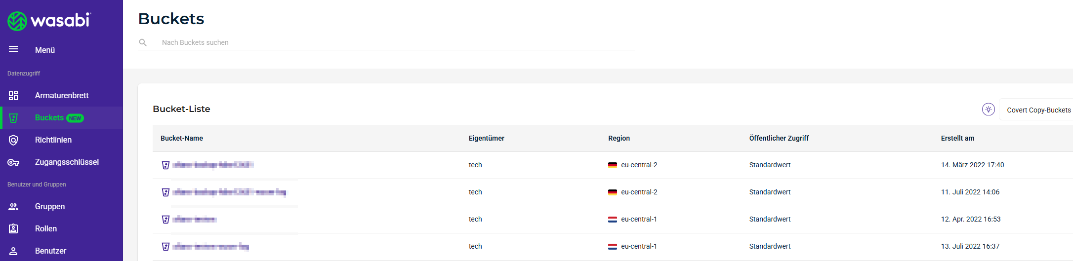 Sie sind nun bereit, mit der Wasabi-Management-Konsole zu arbeiten. Die Bucket-Liste wird angezeigt. Ein Beispiel:
