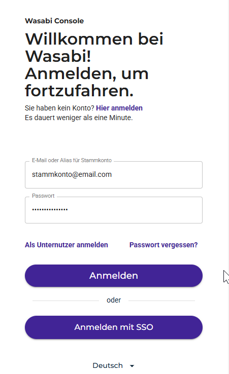 Im Rahmen der Sicherheitsrichtlinien von Wasabi wird das Konto nach fünf aufeinanderfolgenden Fehlversuchen zur Eingabe des Passworts für 5 Minuten gesperrt. In diesem Fall werden im Anmeldefenster eine Warnmeldung angezeigt und eine E-Mail an den Stammbenutzer gesendet.