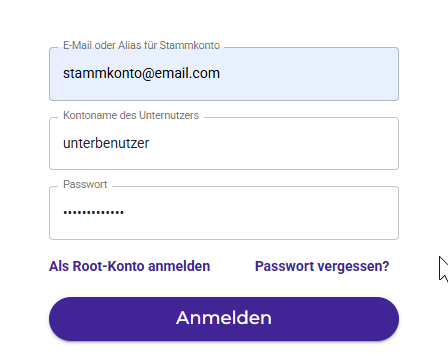 - Um sich als Unterbenutzer anzumelden, klicken Sie bitte auf "Als Unterbenutzer anmelden". Geben Sie dann die E-Mail des Stammkontos, den Namen des Unterbenutzers und das Passwort ein.