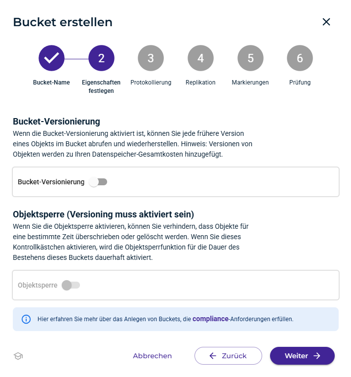 - Ändern der Einstellungen für Versionierung, Protokollierung, Bucket-Policy, Compliance und eine Zugriffskontrollliste (ACL)