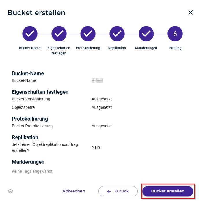 - Die Bucket-Eigenschaften werden zu Ihrer Überprüfung angezeigt. Sie können auf "Zurück" klicken, um die Bucket-Eigenschaften zu ändern. In unserem Beispiel klicken Sie jedoch auf "Bucket erstellen", um die Informationen zu übernehmen und den Bucket zu erstellen.